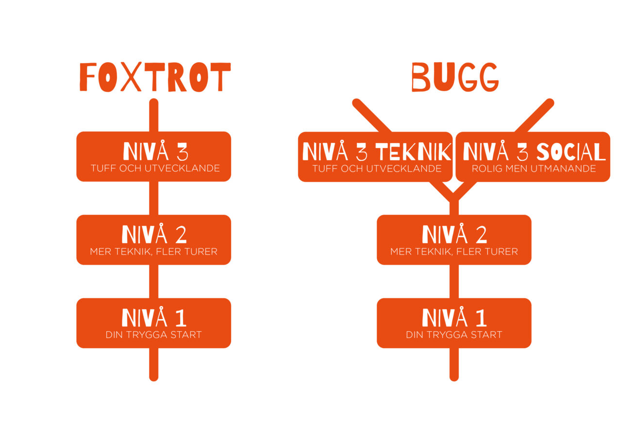 Om du har dansat foxtrot på avancerad nivå kan du välja Nivå 3. Om du vill ha en lite lugnare utmaning tar du Nivå 2. För den som har dansat bugg på avancerad nivå finns två spår: Om du verkligen vill utvecklas och är beredd på hög teknisk nivå och noggrannhet väljer du Nivå 3. Om du älskar att dansa och hålla igång men inte är motiverad på den detaljnivån kommer du att ha superkul på Bugg Social.